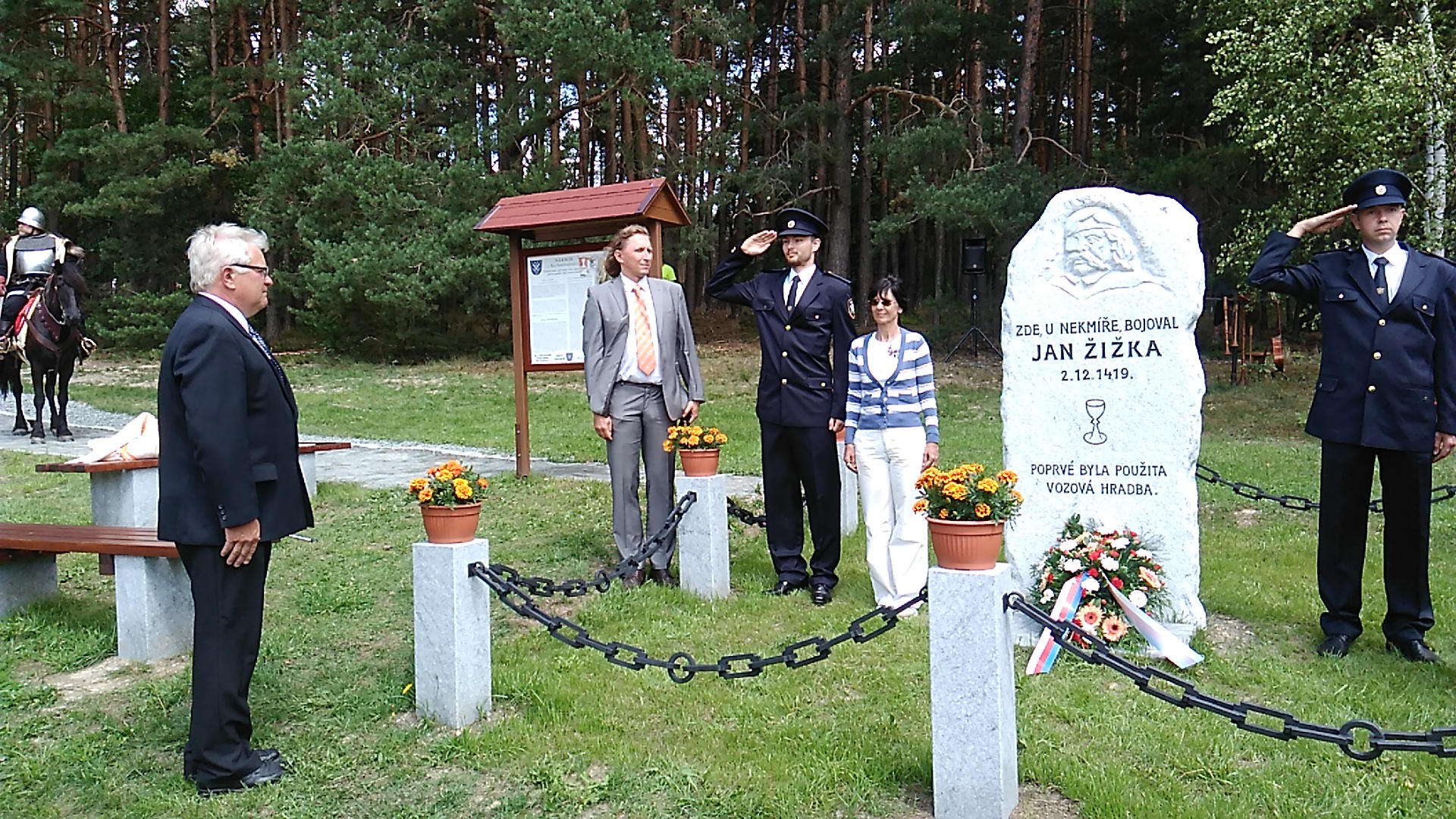 v Nekmíři, hezkém kousku české země odhalovali památník bitvy. Měli to moc pěkně připravené, už v obci byly cedulky ''Památník Žižka'' s šipkou, které nás dovedly až na parkoviště pro tuto příležitost připravenému dole na louce u lesa Na Smrtelnici.