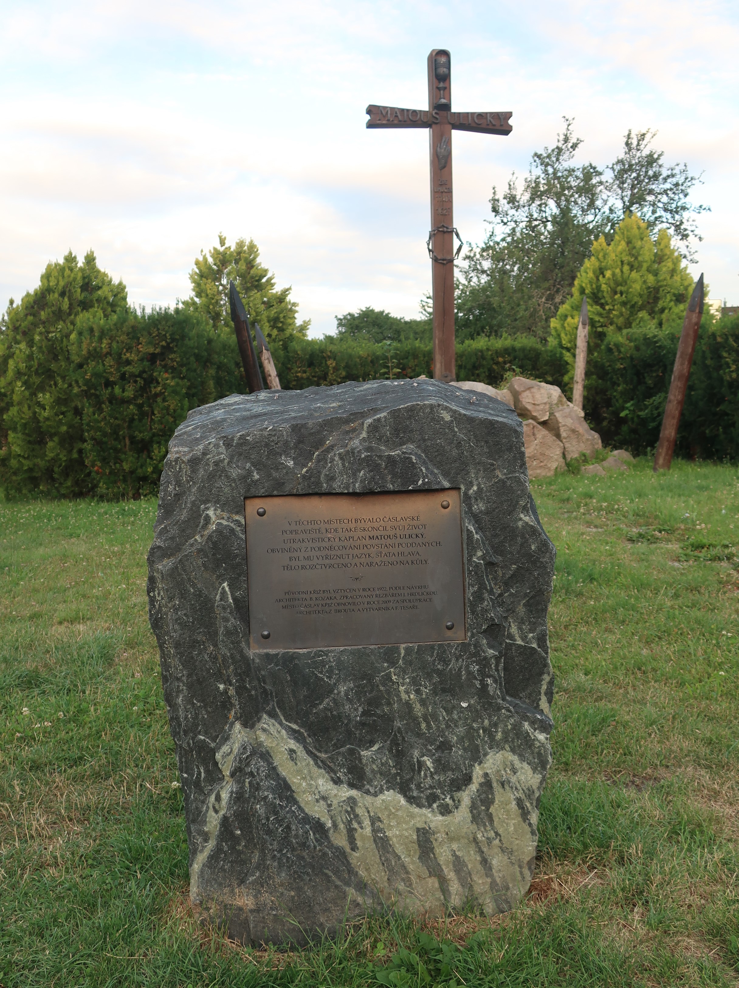 Utrakvistický kaplan Matouš Ulický pocházel z Moravy. Během stavovského povstání kolem r. 1619 odešel do Čáslavi, kde se r. 1621 oženil a stal se děkanem v kostele svatých Petra a Pavla. Již v r. 1624 však musel odejít do emigrace. Roku 1627 se do Čech vrátil, aby navštívil svou nemocnou ženu. V tom samém roce se bohužel také zapojil do nevolnického povstání, v němž sehrál vůdčí roli. Po porážce povstalců na Neštětické hoře (poč. září 1627) se Matouš ukrýval v Krchlebech. Záhy byl však zatčen, převezen do Čáslavi a uvězněn. Následně byl podroben právu útrpnému a 11. 9. 1627 byla provedena potupná poprava. Byl mu vyříznut jazyk, hlava setnuta, tělo rozčtvrceno a naraženo na kůly. Toto ohavné divadlo se odehrálo rovněž v Čáslavi na městském popravišti Na Stínadlech (viz foto).