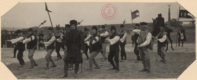 Cvičenci Sokola v husitských kostýmech na V. Všesokolském sletu v roce 1907 (Sbírka Národního muzea)