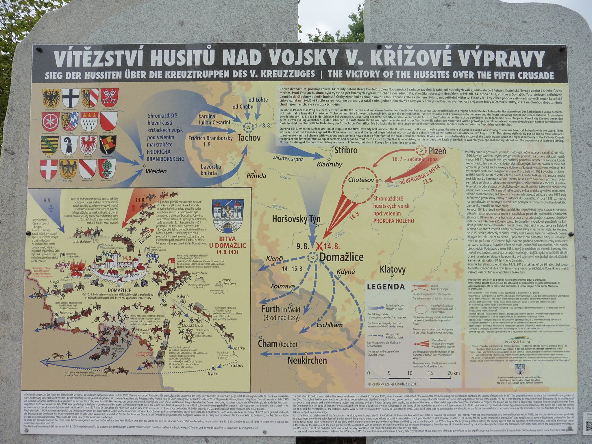 ... Na původním soklu na Baldově byl postaven důstojný nový památník, který od r. 2015 bude nadále a stále připomínat památné vítězství husitů nad poslední kruciátou v r. 1431. Po této fatální porážce všemocná katolická církev konečně pochopila, že husity neporazí mečem, ale musí s nimi začít jednat. A to dokonce na principu "rovný s rovným" dle neméně památného tzv. Chebského soudce z r. 1432.