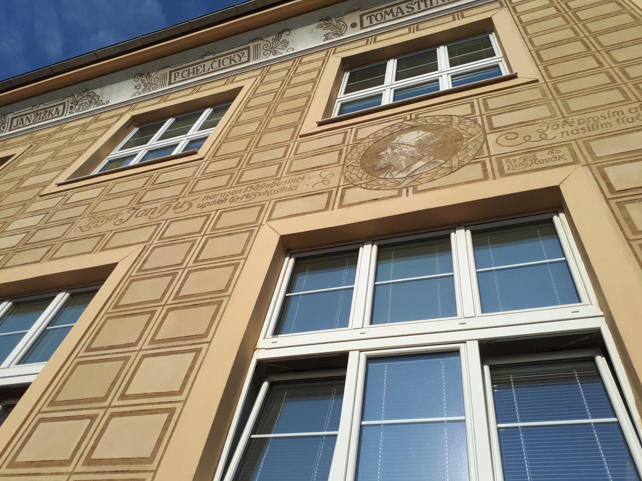 Další rozměr získala školní budova díky spolupráci s Láďou Novákem, pražským malířem, který byl přizván k výzdobě sgrafit a dodal škole jedinečný ráz svým okrasným písmem, které napodobovalo středověké rukopisy. Škola nesla od počátku jméno mistra Jana Husa.