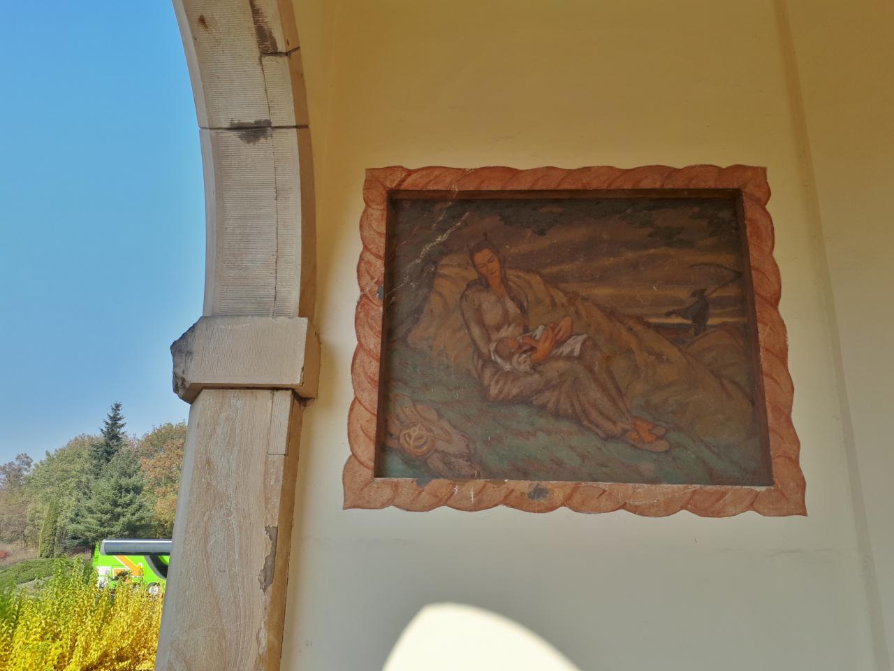 Obraz zdobí podloubí krušovické školní budovy, jedné z nejhezčích v Čechách. Postavena byla v letech 1914-1915 na počest mistra Jana Husa. Její sgrafitová fasáda je poseta jmény českých velikánů, vlasteneckými hesly a lidovými moudrostmi. Za svou výjimečnost vděčí krušovická Husova škola Václavu Rabasovi. Byl to on, kdo jako projektanta budovy prosadil Ladislava Skřivánka-znamenitého pražského architekta, protože nechtěl, aby jeho děti trávily svá mladá léta v jedné z nevlídných tuctových kasárenských školních budov, které se tenkrát na venkově běžně stavěly.
